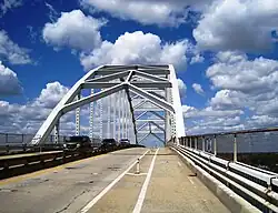 The St. Georges Bridge is a steel tied arch bridge that carries U.S. Route 13 (US 13) across the Chesapeake & Delaware Canal in St. Georges, Delaware. Built by the U.S. Army Corps of Engineers and opened in 1942 as a high-level crossing, the bridge was the first four-lane, high-level crossing to span the canal. It replaced a previous vertical lift bridge which was damaged when a German merchant ship collided with it.[3]