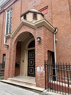 In 1915, the Rose Hill Church merged with the Crawford Memorial Church (located on White Plains Road at East 218th Street in the Bronx); the church on East 27th Street was leased to the Armenians and named "St. Illuminator's Armenian Apostolic Church" in honor of St. Gregory the Illuminator.[7][8][9] Services at the Armenian church began in 1916.[3][9] The church, along with the adjacent six-story apartment house located at 217–219 East 27th Street, were later sold by the Crawford Memorial Methodist Episcopal Church to St. Illuminator's Armenian Church in October 1920.[10][11] Designed in the Greek Revival style, the church building dates back to 1849 and was reconstructed after a fire had destroyed the prior church on the site in 1848.[4][12] It is the oldest Armenian church in New York.[2]