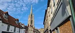 The chancel and nave were re-built between 1430 and 1440. The building of the tower probably commenced in the 1440s or 1450s and was completed to its present height by 1499. Work began on the spire in 1501 and it was not finished until 1515. The weathercock was placed on the top of the spire amongst great rejoicing on the eve of Holy Cross Day, 13 September 1515. This 'wedercoke' had been made in Lincoln from a huge copper basin captured from the Scots at the Battle of Flodden in 1513. It was bought in York by Thomas Tayleyor, one of the churchwardens at St James'. The total cost of the spire alone was £305 8s 4d, (equivalent to £285,800 in 2023).[5]