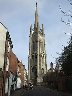 The church is a medieval building. It has the tallest steeple of any medieval parish church in Britain. A recent survey has confirmed the height of the stonework as 287 feet 6 inches (87.63 m) and to the top of the cockerel weather vane as 293 feet 1 inch (89.33 m). It also confirms it as one of the very finest medieval steeples in the country[4]
