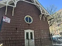 The main section of the church measures 58 by 30 feet (17.7 by 9.1 m), with its longer axis running west-east parallel to 51st Avenue.[53] The facade is composed of cement asbestos shingles over wood shingles.[24] The northern and southern facades each contain three round-arched window openings outfitted with lancet windows,[24][54] while the eastern facade contains two round-arched window openings.[54][45] The front entrance is on the eastern facade, facing Broadway, and is composed of double doors underneath a circular window measuring about 5 feet (1.5 m) in diameter. The roof is a gable roof with overhanging eaves supported by flared brackets. A brick chimney is located above the western section of the roof.[24][54]