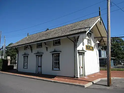 St. James station was built in 1873, along the Smithtown and Port Jefferson Railroad in the northern part of the Town of Smithtown.[4] The station house, designed by Calvin L'Hommedieu, remains the second-oldest existing station-house of the Long Island Rail Road, surpassed only by Hewlett station, which was originally built in 1869 by the South Side Railroad of Long Island. When the Flowerfield station to the east was abandoned in 1958, the commuters who previously used that depot at the Gyrodyne Company of America were redirected to the St. James and Stony Brook, New York depots. Until 1964, the station also contained an express house and an outhouse, both of which were demolished along with some trees to make room for an expanded parking lot, much to the chagrin of the community. The station is located within the Saint James District, which was added to the National Register of Historic Places in 1973.[5]