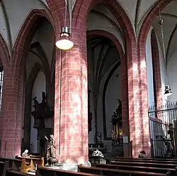 The almost square groundplan of the building is divided into nine sections. The three aisled late Gothic nave has a square choir at one end, flanked by a southern side choir and a northern passageway containing the organ loft. The three bays of the west end of the nave are of equal size. A trapezoidal crossing space permits a wider choir bay at the east end. The central bay at the west end supports the tower, which is not visible from inside the church, since the mass of the enormous, high-spired tower is distributed onto the pillars without variation in the height of the roof vaults.[1]