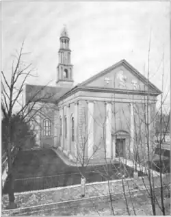 Under the pastorate of Rev. John DuBois, construction on a new building for St. John's Church began, and the cornerstone was laid on May 15, 1800. (This cornerstone was rediscovered in 1904,[1] and sits at the entrance of the church today[2]). DuBois' successor, Rev. John McElroy, S.J. decided to demolish this building and erect a new church. Construction began in 1833, and the completed church was consecrated on April 26, 1837, becoming the first consecrated church in the Archdiocese of Baltimore and the largest parish church in the United States.[1] During the Civil War, the church was converted in its purpose as a jail for captured Confederate soldiers. Jesuit involvement in the church came to an end in 1902, after their novitiate located across the street from St. John's relocated to New York.[1]