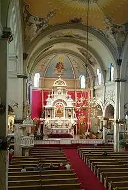 The interior of the church contains five altars. On the main altar there is a painting of St. Josaphat, dressed in the vestments of an eastern rite bishop. The side altars are dedicated to the Virgin Mary and St. Joseph, and in the transept of the church are altars dedicated to Saints Anthony of Padua and Francis of Assisi. The woodwork in the church is crafted of white oak, and there is an extensive collection of murals on the walls.[3]