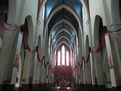 Windows are fitted with tall stained glass and have pointed arches.[5] The cathedral's stained glass windows were produced in France before being transported to Vietnam.[18] The ceiling is rib-vaulted like those seen in medieval Europe. The nave is weathered, while the sanctuary is made of polished gilt-trimmed wood, similar to that of Phát Diệm Cathedral, and has architectural embellishments in the imperial Huế style. A statue of the Virgin Mary is kept in a palanquin according to local custom, which is seen to the left of the nave. A pipe organ designed by the Belgian craftsman Guido Schumacher, was installed in the cathedral on 23 November, 2022, as part of a cultural exchange project between Itami in Japan and Hasselt in Belgium. The instrument has 1,850 pipes.[23]