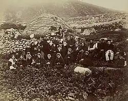 Visiting ships brought cholera and smallpox in the 18th century.[4] In 1727, the loss of life was so high that too few residents remained to man the boats, and new families were brought in from Harris to replace them.[note 8] By 1758 the population had risen to 88, and it had reached just under 100 by the end of the century. This figure remained fairly constant from the 18th century until 1852, when 36 islanders, with the help of the Highland and Island Emigration Society, emigrated to Australia on board the Priscilla; reducing the population to 70.[59] Among the emigrants was Ewen Gillies. The laird of St Kilda, Sir John MacLeod, tried to persuade some of the group to return to the island; when they were unconvinced, he paid for their voyage to Australia.[59] Eighteen of the 36 St Kildans died of sickness on the ship or in quarantine.[59][60][61] The island never fully recovered from the population loss.The emigration was in part a response to the laird's closure of the church and manse for several years during the Disruption that created the Free Church of Scotland.[62][63]