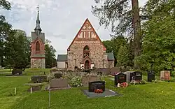 The façade of the church is reminiscent of other Finnish medieval churches, such as the Porvoo Cathedral. The reason for the similarity is that many churches from that time period in southern Finland were designed by the same person, the anonymous Pernajan mestari, who is presumed to be a German architect. The church has, however, been redesigned to some extent following the fire of 1893, leading to the current design being a mixture of Medieval and Gothic Revival architecture.[3]
