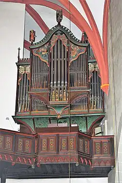 The present organ was completed in 1984, built by Fischer & Krämer. The organ has 43 stops, three manuals and pedal.[1] Many features of the former 1880 instrument by Ratzmann were used in the new organ.[7] The church has been the venue of the annual organ concert of the Rheingau Musik Festival from its beginning in 1987,[8] with performers such as Marie-Claire Alain, Kay Johannsen, Edgar Krapp, and Olivier Latry from Notre-Dame de Paris who played on 7 July 2019.[9] Johannes von Erdmann, organist at the church from 1987 to 2001,[10] made recordings on the organ.[11]
