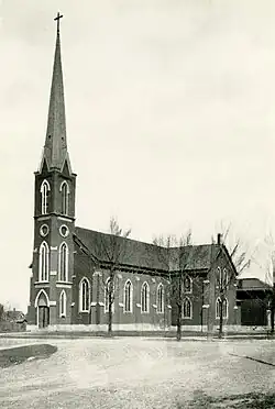 ![]() The Saint Mary Church in Lansing, Michigan, in winter (ca. 1881) viewed from across the intersection of Madison and Chestnut Street. The parsonage can be seen just north of the church, at the far right of the photo, and a one-story addition is barely visible around the corner of the transept. | |