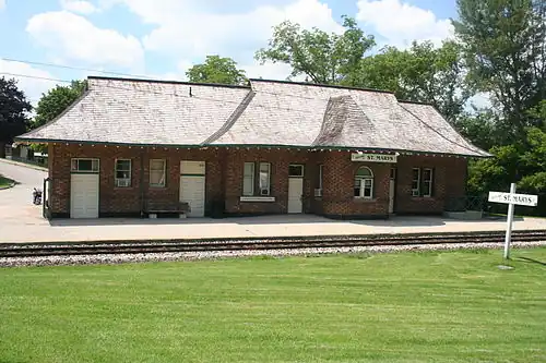 St. Marys station in St. Marys, Ontario, Canada is a staffed[1] railway station used by Via Rail's Corridor intercity train service. The station is served by one daily train in each direction between Toronto and Sarnia via London.[2]