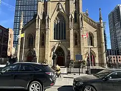 St. Michael's Cathedral is located to the northwest of Church and Shuter streets in Toronto, with the parish office at 200 Church Street. The building is oriented on an off-east–west axis aligned perpendicular to Church Street, with the main entrance on its west side located at 65 Bond Street. In adherence with the tradition of medieval churches, the cathedral's high altar is in the east end of the building, facing Jerusalem.[2] The general composition of the building resembles that of a 13th or 14th century Gothic cathedral; however, the design is simplified and does not contain elements such as flying buttresses, transepts, or ribbed vaults. Also, because there are no transepts, the cathedral itself does not assume the typical cruciform shape of most medieval Gothic cathedrals.[15] Conversely, the secondary altars, or side-chapels, divide the cathedral in two down its length, providing a slight outcrop visible from the exterior. The building can be further subdivided down its length by the nine bays framed by the buttresses on the exterior of the building.