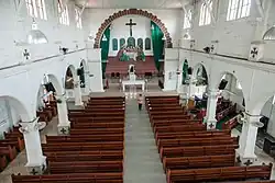 The church consists of a nave and two aisles, each with a flat wooden ceiling. The side aisles and the upper sides of the nave are provided with arched windows that provide the interior with plenty of natural light. There is a gallery, which is accessible by a narrow spiral staircase to the entrance area. The church interior is equipped with wooden benches; about 20 double rows in the nave and 15 benches in the left aisle. The right aisle seats are reserved for choir and band. The chancel or altar is adorned with a scene of the Last Supper.