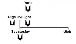 While Olga's birthdate is unknown, it could be as early as 890 AD and as late as 925 AD.[11] According to the Primary Chronicle, Olga was of Varangian (Viking) origin and was born in Pleskov.[12][13] Little is known about her life before her marriage to Prince Igor I of Kiev and the birth of their son, Sviatoslav. According to Alexey Karpov, a specialist in the history of ancient Russia, Olga was no more than 15 years old at the time of her marriage. Igor was the son and heir of Rurik, founder of the Rurik dynasty. After his father's death, Igor was under the guardianship of Oleg, who had consolidated power in the region, conquering neighboring tribes and establishing a capital in Kiev.[14][15] This loose tribal federation became known as Kievan Rus', a territory covering what are now parts of Russia, Ukraine, and Belarus.