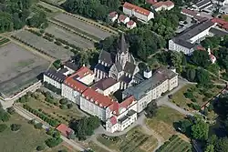 The abbey church, dedicated to the Sacred Heart, was built between 1897 and 1899. Its pointed octagonal spire, 75 metres high, can be seen from a great distance around. In the bell tower hang eight bells, sounding one of the deepest tones in southern Germany.[2]