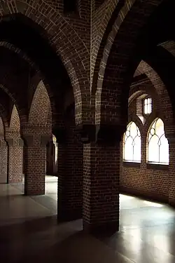St. Paul's Abbey was founded by monks from Wisques Abbey in Wisques in the Pas-de-Calais who were forced to leave France by the anticlerical policies and popular feeling of the period. The community settled initially in Belgium, at first in Honnay and later in Montignies-Saint-Christophe.[1] The Benedictine nuns of Wisques had already settled in Oosterhout in the Onze-Lieve-Vrouweabdij (Abbey of Our Lady, Oosterhout) and the abbot of Solesmes wanted both communities close to each other in the same town. The monks therefore bought 2 hectares of land nearby but had difficulties with the Dutch architect who was working for the nuns.[2] Eventually the new priory was built under the supervision of the architect Dom Bellot, and proved to be a masterpiece of brick architecture, as well as the architect's first great work.[3] The building was finished in 1907 and the community was raised to the status of an abbey in 1910. Dom Jean de Puniet was the first abbot.[4]