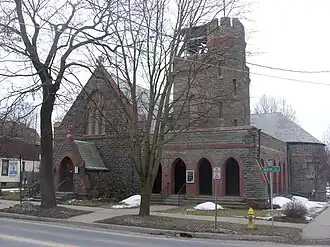 St. Paul's Church is a historic Episcopal church located at Owego in Tioga County, New York. It is a High Victorian Gothic style structure built of rough cut bluestone trimmed with orange brick and terra cotta. The church is composed of a small entry vestibule, the gabled main block housing the nave and chancel, a shallow transept lying opposite a semicircular Lady Chapel, a tower, and an arcaded porch and a sacristy. It was designed by architect William Halsey Wood (1855–1897) and was built in 1893–1894.[2]