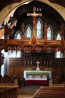 In January 1884, the building burned and was replaced by the present structure. From 1889 to 1912, Bishop Charles Chapman Grafton worked to complete the interior of the building. Early acquisitions were a pulpit (created by local stone carver Robert Powrie), a brass eagle lectern, and the German-Victorian carvings from 1893 to 1894. The carvings came from Munich and included the twelve Apostles, St. Paul, and twenty-five angels.