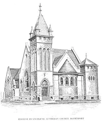 The Lutheran Church was the last mainline Protestant congregation to organize in Davenport.[2] Early attempts were made among the German immigrants, but they were met with only minimal success. In 1861, a German Lutheran minister was sent to Davenport. A year later he started organizing First German Evangelical Lutheran Zion Church and a building was erected in 1866. Theological disagreements erupted within the congregation and the pastor and a group of parishioners left to form Trinity German Evangelical Lutheran Church in 1869. They affiliated with the Lutheran Church–Missouri Synod. Zion languished until a new wave of German immigration came into the city in the 1870s. They continued German language services until World War I. Both Zion and Trinity remain in existence.