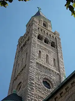 During the next pastorate of Monsignor James O'Brien, who began in 1888, the demolition of the church began in 1889. The foundation of the building was dedicated by Cardinal James Gibbons on November 23, 1890. Within the year, the building was sufficiently complete to allow Mass to be said in the church on Christmas day. By the end of 1889, the building made of granite and marble quarried in Maryland was complete, with its spire rising to 140 feet and the nave seating 950 people. It was outfitted with French glass windows. In 1901, the rectory was rebuilt under O'Brien to provide for more comfortable living conditions. O'Brien retired in December 1922 and was succeeded by Eugene J. Connelly as pastor in 1922, previously the chancellor to the archbishop. A new school was built in 1923 and again in the 1930s due to overcrowding.[3]