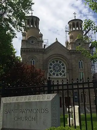 The original Church became too small and many parishioners had to stand at Mass because it was over capacity. On August 4, 1897, ground was broken for the new Church, designed in the Byzantine Revival-style. The architect of St. Raymond Church was George H. Streeton of Brooklyn who also designed the Cathedral Basilica of St. James in Brooklyn, as well as St. Raphael's Church in Manhattan (1900–1902). The building was dedicated 23 October 1898.[1] In 1932, the old main altar of wood was replaced with one of marble.