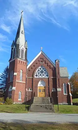 The current church was designed by George H. Guernsey (1839–1900), a self-taught architect who had served for a term as mayor of Montpelier, Vermont in 1897,[5] and had designed a number of prominent buildings in Vermont and New Hampshire, including a number of catholic churches, such as; St. Augustine Church (Montpelier, VT), Immaculate Heart of Mary Church (Rutland, VT), Notre Dame de Victories Catholic Church (St. Johnsbury, VT),[6] and the Sacred Heart Saint Francis de Sales Roman Catholic Church (Bennington, VT); as well as churches for other denominations, including; the Methodist Episcopal Church (Barton, VT) and the United Baptist Church of Lakeport (Laconia, NH). Of his architectural style, it has been stated that Guernsey employed dramatic corner towers and asymmetrical massings in his designs, often combining "square-spired" and "conically topped round towers".[7][5]