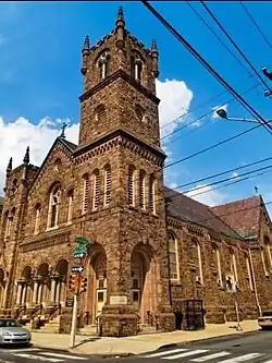 Father John J. Donnelly (1851-1927)[8] was appointed rector in 1889 and he found the location of the chapel "not sufficiently central for the parish."[4] The congregation had grown from 75 parishioners to 4,000, and settlement had moved west of the original chapel.[9] Rev. Donnelly purchased a lot on the northeast corner of Sixth and Tioga Streets and a new Norman-Romanesque chapel and school, of Trenton brownstone, was erected and dedicated on April 22, 1894. Three years later, a new rectory in the Second Empire style was completed.