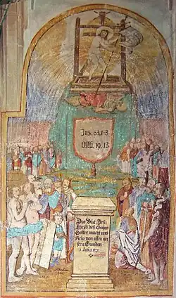 Unlike the late medieval paintings, the 17th century murals were not painted over. However, they have been refreshed several times, as they were not frescoes but painted in mixed technique on lime slurry and are therefore less durable.[8]