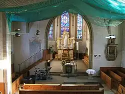 To the east, the nave is joined by the choir, the width of which corresponds to that of the nave without the chapels. The choir and nave are separated by a choir arch. The choir is almost twelve meters long and has three transverse axes and a three-axis apse. The corners of the choir polygon and the axis flanks on the south side are provided with external buttresses. The rectangular sacristy, the length of which corresponds to two choir axes, adjoins the north side of the choir. In width, it projects a little beyond the alignment of the nave north wall.[6]