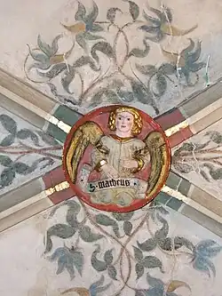 In the chancel is a circa 1660 Apostles' Creed cycle that begins on the south wall with three apostles and continues on the north wall with six more. The last three apostles on the north wall were washed away in favor of the late medieval sacrament house carpet over which they were painted. The order of the apostles, and thus the assignment of the twelve articles of the Apostles' Creed, corresponds to the common practice of combining apostles and creedal articles in a largely arbitrary manner.[9] Between the two windows of the south wall of the choir is Apostle Paul, somewhat isolated from this cycle. The text attached to him in place of an article of creed begins with a quotation from Pauline epistles (2 Cor 11:5 EU), which underscores his ambivalent affiliation with the other apostles. The images of the apostles on the walls of the choir are complemented by one image each of Christ and John the Baptist, who is located in the northwest corner of the choir in close proximity to his namesake, John the apostle, who belongs to the cycle. In the corners of the choir polygon there were originally probably three representations of archangels, of which only Rafael is preserved.[8]