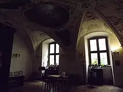 The entrance to the sacristy is in the south wall of the chancel. The pointed portal is profiled in the same way as sedilia. There are remains of original mural above the entrance. The painting depicts the genealogy of Jesus Christ. The Baroque sacristy was built in 17th century. It is square shaped, it has two window axis and a low barrel vault. The vault is covered with rich stuke decorations of leaves and heads of angels.