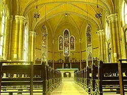 The campus also has a leisure space known as "The Woods" which includes a couple of large trees.[63] The college runs a small hostel on campus for male students of the senior college. The hostel has a capacity of 60 students, two to three occupants to a room.[9][60] The college also has a chapel cum prayer hall with green, stained-glass exteriors, arching vaults, and intricate marble work, behind the façade facing the college quadrangle.[13][64] It has two fully equipped audio-visual centres, the Smith Centre for Audio-Visual Instruction (SCAVI), with a seating capacity of 100, and the Multi-Media Room (MMR) which seats 110. Classrooms have partially Information technology (IT) enabled accessories, fiberglass boards, and pull-down screens.[3][60] A full-fledged language laboratory has also been set up to cater to students from non-English medium schools and to promote multi-language skills.[37] There is also an auditorium, a spacious canteen, and full-size basketball and volleyball courts. The Fell Gymkhana, built in 1954, provides bodybuilding, badminton, table-tennis, carrom, chess, and other recreational facilities for staff and students. The St. Xavier's Villa in Khandala is a property of the college nestled in the hills of the Western Ghats mountain range, about two hours from Mumbai. It provides facilities for retreats, seminars, and educational conferences. The college also has a cricket pitch leased by the Brihanmumbai Municipal Corporation (BMC) on the Azad Maidan sports ground, near the college.[38][62]