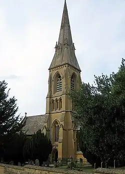 Prior to the 1870s, the church was dedicated to St Leonard. Originally founded before 1666, the church was rebuilt for the first time in 1723 by Thomas Charles Tracy, 5th Viscount Tracy. The building of 1723 was a small Perpendicular structure, of which only very small elements are known to still exist.[1] It was demolished in 1868 and the church was rebuilt almost entirely in 1868–69 by George Edmund Street (1824–1881). Street was commissioned by the 3rd Lord Sudeley. The work cost £44,000, equivalent to around £20 million in the 21st century. An illustration of the finished church was featured in The Building News on 5 January 1870.[2] It was rededicated to St Andrew after the rebuild was completed. Little remains of the earlier buildings aside from some loose effigies dating from the 17th Century and three marble wall monuments from the 18th Century.