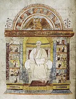 Of the four portrait pages, only that for Luke survives (Folio 129v). He is shown sitting on a marble throne, with a cushion, in an elaborate architectural setting, probably based on the scaenae frons of a Roman theatre – a common convention for Late Antique miniatures, coins and Imperial portraiture. The pose with the chin resting on a hand suggests an origin in classical author portraits of philosophers – more often evangelists are shown writing. Above a cornice sits the winged ox, Luke's evangelist's symbol. The pediment has an inscription with a hexameter from the Carmen Paschale by the 5th-century Christian poet Coelius Sedulius (Book 1, line 357):[22] "Iura sacerdotii Lucas tenet ore iuvenci" – "Luke holds the laws of priesthood in the mouth of the young bull" (iuvencus meaning also "young man").[23]