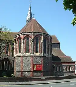 Although Pearson, having been responsible for the design of many important church buildings throughout Britain in the second half of the 19th century, considered St Barnabas to be one of his less significant works – describing it as "one of my cheap editions" — it has become one of the few Grade II*-listed churches in Brighton and Hove.[7][8][9] In common with several other late-19th century churches in the city, such as the Church of the Annunciation, the main construction material was flint which had been knapped to produce flat stones suitable for building walls. The roofline and windows are embellished with red-brick dressings, and the lancet windows reflect the Early English Gothic and Decorated Gothic styles.[8][10]