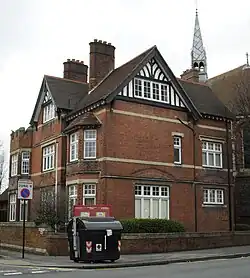 A vicarage was added in 1893 by different architects, while in 1907 George Frederick Bodley, an architect closely associated with Brighton's churches, provided a large reredos consisting of a gilded wooden triptych whose central panel depicts the Crucifixion. This was one of Bodley's last works before his death in the same year.[5] A set of choir stalls and a pulpit, both made of oak, were added soon after the church was finished, as was a font of alabaster. There are various stained glass windows, including one commemorating victims of World War I; however a tower intended for the southwestern corner was never completed.[5][8]