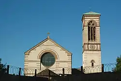The architect was Sir Arthur Blomfield, a son of the Bishop of London, who had previously designed the chapel for the Radcliffe Infirmary. The architectural style is that of a Romanesque basilica, possibly modelled on San Clemente in Rome or the Church of Santa Maria Assunta in Torcello. St Barnabas has a distinctive square tower, in the form of an Italianate campanile, that is visible from the surrounding area. The church was built on land donated by George Ward, a local land owner and member of the influential Ward family (named as the donor in the land conveyance, etc. in the Oxford Diocesan Archives). George's brother William Ward was Mayor of Oxford on two occasions, 1851/2 and 1861/2.[4] It was consecrated in 1869 by Bishop Wilberforce of Oxford and the campanile was completed in 1872. The pulpit was added in 1887 by Heaton, Butler, and Bayne with the panels painted by Charles Floyce.[5][6] This replaced a cylindrical timber pulpit with columns and a moulded cornice which is now at St Peter's, London Docks.[7]