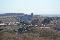 St Catherine's Hill, together with Ramsdown and Blackwater hills, comprise a 3-mile (4.8 km) long ridge running roughly north to south between the Avon and Stour valleys just to the north-west of where the rivers converge in the borough of Christchurch in Dorset.[11][30][31] The top of this ridge is almost a level plateau, 45 metres (148 ft) above sea-level at the southern end and 49 metres (161 ft) in the north. St Catherine's hill, in the south, forms the highest point of this three hill chain at 53 metres (174 ft) and has some of the steepest slopes at 1:1 or 45°.[30][31] The 400 acres (160 ha) site is a mixture of woodland and heath and is part of a larger Site of Special Scientific Interest (SSSI). The eastern slopes and foot of the hill, an area referred to as the Town Common, is almost exclusively open heath and as such has also been designated a Special Protection Area (SPA) and Special Area of Conservation (SAC).[18][31]