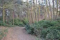 Coniferous woodland dominates the top and western slopes of the hill and comprises mostly maritime and Scots pine. Broadleaf trees are mainly confined to the south and west side but also occur on the lower east side. They include grey willow and downy birch and the occasional aspen in damper areas. Some trees, particularly the conifers have become invasive and a programme of removal has been instigated.[40] The hill's mix of woodland and heath provides habitats for a number of important bird species including birds of prey such as the hobby (Falco subbuteo), buzzard (Buteo buteo), hen harrier (Circus cyaneus) and merlin (Falco columbarius);[37][41] woodland birds including the song thrush (Turdus philomelos), crossbill (Loxia curvirostra) and green (Picus viridus) and great spotted (Dendrocopos major) woodpeckers, all of which are declining in numbers;[37] and wetland birds such as snipe and the red shank (Tringa totanus).[36] Many of these species also use the area for breeding, along with the rare Dartford warbler (Sylvia undata), woodcock (Scolopax rusticola) and nightjar (Caprimulgus europaeus).[36][41]