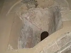 Above the western arch is the remains of an 11th-century window.[27] This had been blocked off when the south aisle and arches were constructed in the early 14th century and was restored in 1896.[29] On the south side, on what was originally the exterior wall, it has an arched lintel and jambs of two very wide blocks each and no sill. The aperture is about 9 in (0.2 m) wide and 2 ft 0 in (0.6 m) high.[29] The north face is widely splayed, with a round head of three long voussoirs; the window is about 3 ft 5 in (1.0 m) high to the springing.[29] On the eastern splay of the window are remnants of a wall painting, which have been dated to 1220.[17][26] The painting is part of the Christmas story and shows the shepherds with a dog looking up to the Star of Bethlehem. Above them are the arms of an angel pointing to the star and holding a palm branch.[26]
