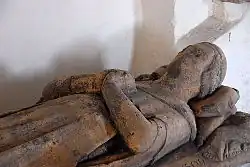 There are a number of historical monuments in St Chad's Church, two of the most notable are located in the south aisle and are dedicated to former priests. The largest of these is an effigy of William de Harrington dating from 1346,[4] which shows him reposing on a pillow supported on two angels whilst dressed in cassock, hood and pileolus whilst at his feet are images of the Green Man.