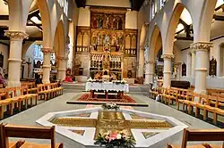 The reredos, designed by Nicholl, in the Sacred Heart chapel was added in 1902, with four angels in niches are holding the instruments of the Passion; in the central niche is a statue of the Sacred Heart by Theodore Phyffers (1821-1876), a Belgian-born sculptor working in London.