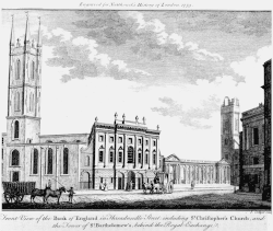 St Christopher le Stocks was a parish church[1] on the north side of Threadneedle Street in the Broad Street Ward of the City of London. Of Medieval origin, it was rebuilt following the Great Fire of London in 1666, but demolished in 1781 to make way for an extension of the neighbouring Bank of England.