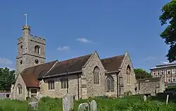 The church, with its 80-foot west tower, sits in a prominent position on a hilltop overlooking the town harbour, and was traditionally an important landmark along the Thames Estuary.[3] It was rebuilt using Kentish ragstone and flint rubble in the late 15th or early 16th on the site of a previous church, possibly dating back to the 13th century.[4] The 14th-century chancel may also have survived the rebuilding, along with a pre-Reformation piscina near the altar. A brick porch was added in the Tudor period.