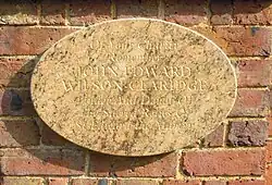Plaque on the exterior wall to John Edward Wilson-Claridge, who recovered the remains of Edward the Martyr