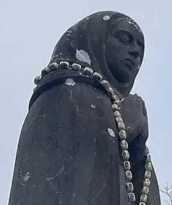 The site contains a life-sized limestone statue of Saint Gobnait commissioned by locals from the Irish sculptor Seamus Murphy. It was completed in 1951 and unveiled that year on Whit Sunday.[8][9][10] Murphy was one of the best known Irish sculptors at the time, and his design is renowned for its "simplicity and beauty".[8] Gobnait is shown standing on a pedestal, under which is a beehive. The sides of the pedestal are lined with carvings of bees and stags, reflecting her legend, while a set of independent rosary beads hangs from her neck.[8]