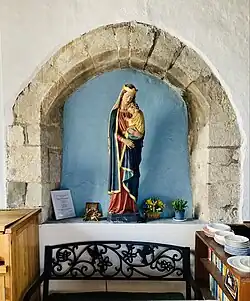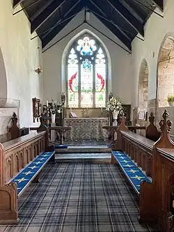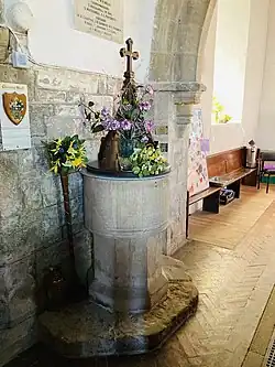 The south aisle was demolished in Elizabethan times but remains of it survive inside the church. The church includes part of a Saxon grave cover, originally part of a Celtic cross,[2] unusual early Tudor bench-ends with poppyheads featuring initials, possibly of churchwardens or their families[2][4] and Restoration plaques which record the work tradesman such as "putty makers". On the wall above the chancel arch is mounted a Royal Charter of George I Coat of Arms dated 1722.[4] There is also a memorial tablet to Francis Bond (1852–1918), the late 19th-century authority on Gothic architecture, who was born in the village.[1]