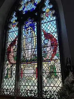 The East Window is mid-20th century with glass designed in a romantic/heroic style incorporating elements of mysticism, chivalry and patriotism of a fairly muted kind. There are four lights, one seven-lobed rose at the top and three decorated lancets beneath. The general theme is the Risen Christ who occupies the centre lancet beneath an ambiguous depiction which might be God the Father or another Risen Christ. The main figure is flanked by two seraphim, one holding the bread and wine of the Eucharist and the other holding the crown of thorns, both kneeling.[4]
