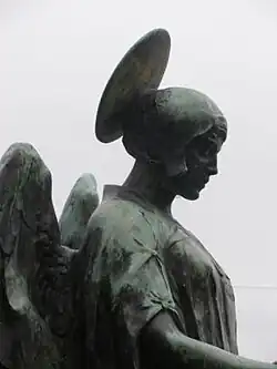 There are two signed bronze sculptures by Gilbert Bayes, a pupil of Sir George Frampton and a key figure in the "New Sculpture Movement". One, commemorating the 1st Lord Nunburnholme who died in 1907, is in the form of the figure of Victory with a laurel wreath, while the other, nearer the church, is in memory of his youngest son, Gerald Valerian Wilson. It represents a standing angel, with a nimbus, reading the Book of John. The smaller details of these memorials were stolen many years ago. The two sculptures originally stood in the Italian Garden of Warter Priory and were moved to St James' in 1929. They stand near a table-top tomb to the 2nd Lord Nunburnholme and a grave slab to Edith, Countess of Chesterfield, daughter of the 1st Lord Nunburnholme.