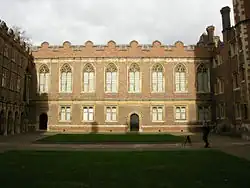 The site was originally occupied by the Hospital of St John the Evangelist, probably founded around 1200.[11] The hospital infirmary was located where the east end of the current chapel now stands.[12] By 1470 Thomas Rotherham, Chancellor of the university, extended to the hospital the privileges of membership of the university.[11] This led to St John's House, as it was then known, being conferred the status of a college.[13] By the early 16th century the hospital was dilapidated and suffering from a lack of funds. Lady Margaret Beaufort, having endowed Christ's College, sought to found a new college, and chose the hospital site at the suggestion of John Fisher, her chaplain and Bishop of Rochester.[11] However, Lady Margaret died without having mentioned the foundation of St John's in her will, and it was largely the work of Fisher that ensured that the college was founded. He had to obtain the approval of King Henry VIII of England, the Pope through the intermediary Polydore Vergil, and the Bishop of Ely to suppress the religious hospital (which by then held only a Master and three Augustinian brethren) and convert it to a college.